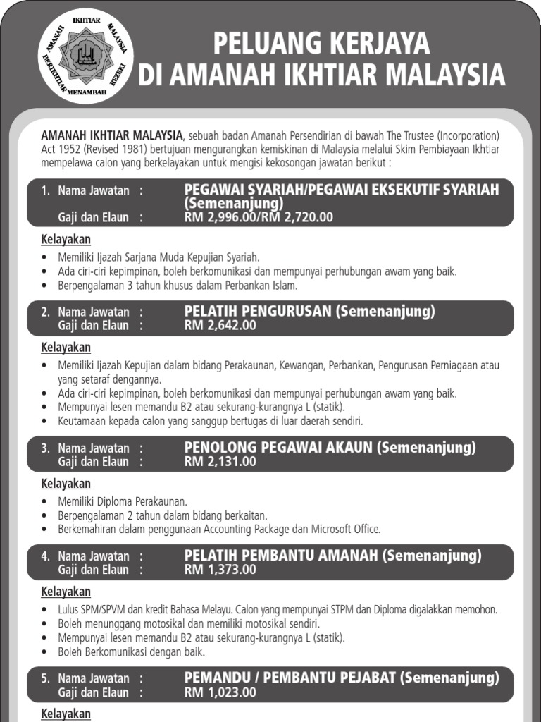 Jawatan kosong amanah ikhtiar malaysia chris ellis. Peluang kerjaya bagi eksekutif audit dan teknologi maklumat.maklumat lanjut ada kat sini. Amanah raya berhad atau amanahraya, dahulunya dikenali sebagai jabatan pemegang amanah raya dan pegawai pentadbir pusaka telah ditubuhkan pada 1 mei 1921. See more of amanah ikhtiar malaysia on facebook. Jawatan kosong di amanah ikhtiar malaysia aim 2019.